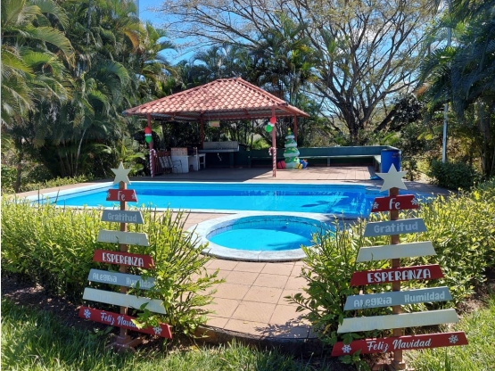 - Cuenta con una cabaña rústica de 3 habitaciones, un baño y sala para TV, un rancho para BBQ, piscina, amplia zona verde.